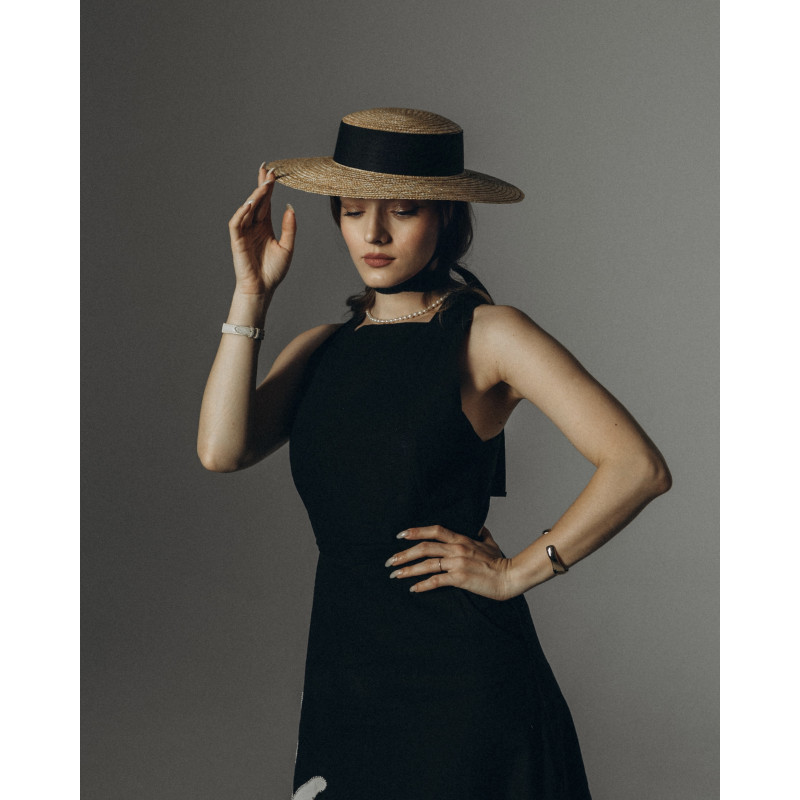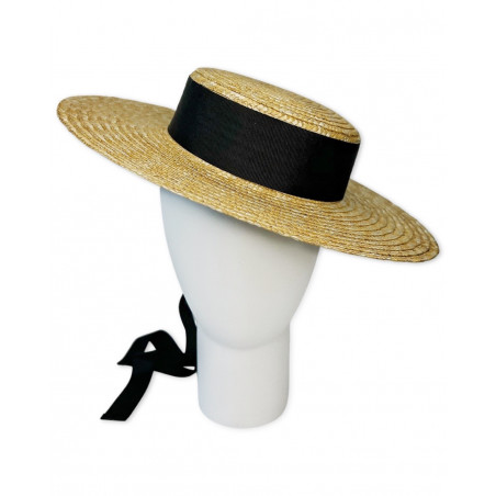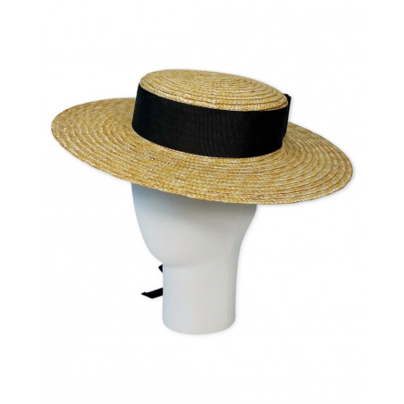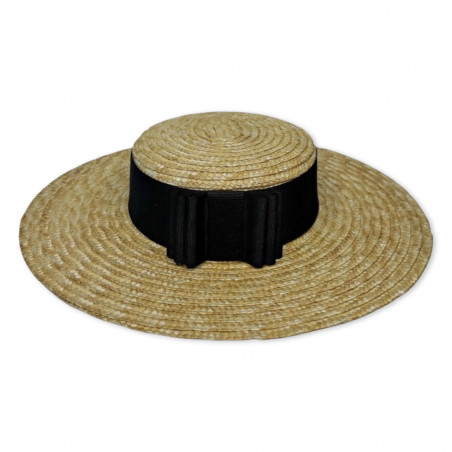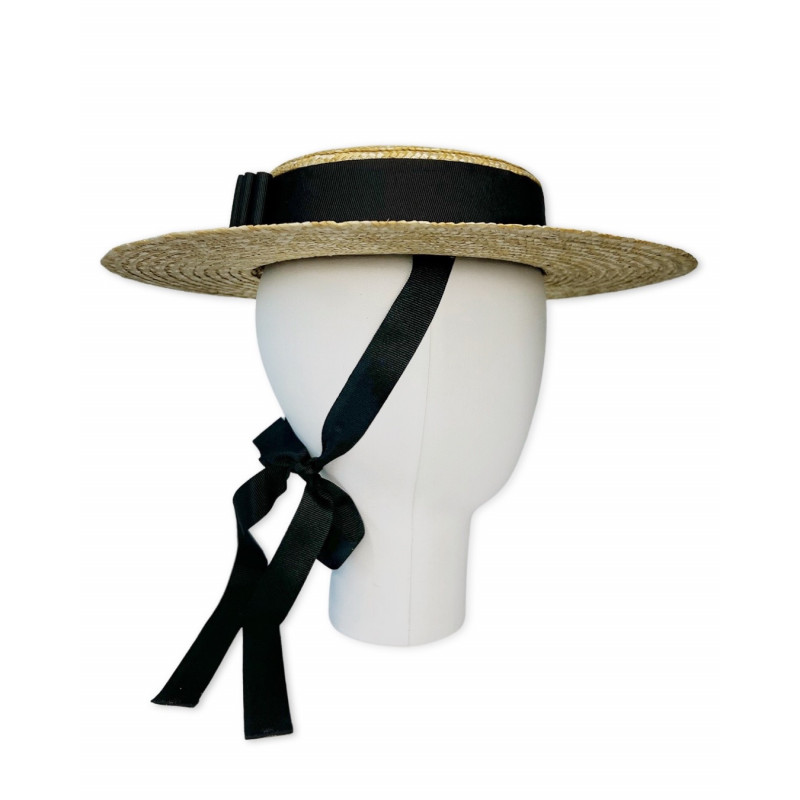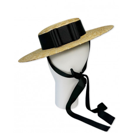 Natural straw canotier hat, adorned with large grosgrain ribbon and back bow in black color.