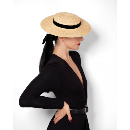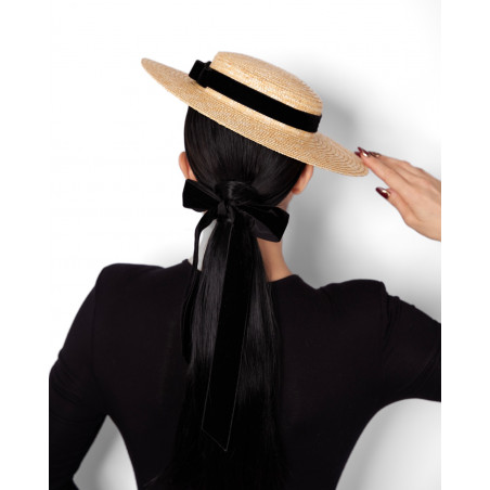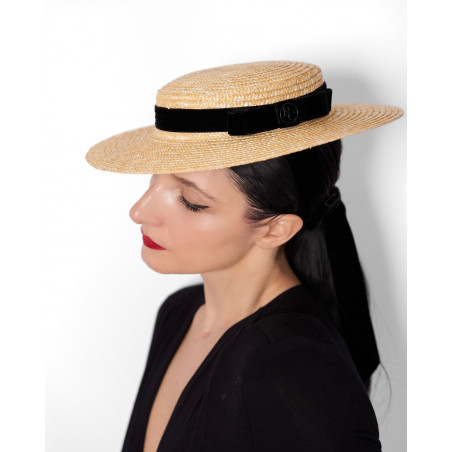 Straw boater hat with flat brim and small silky bows. Made in France.