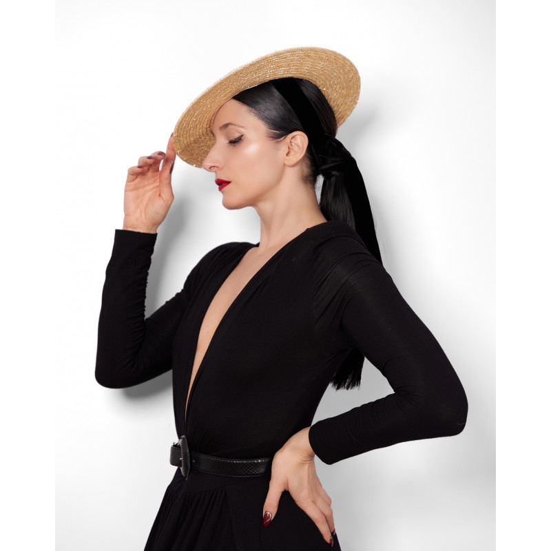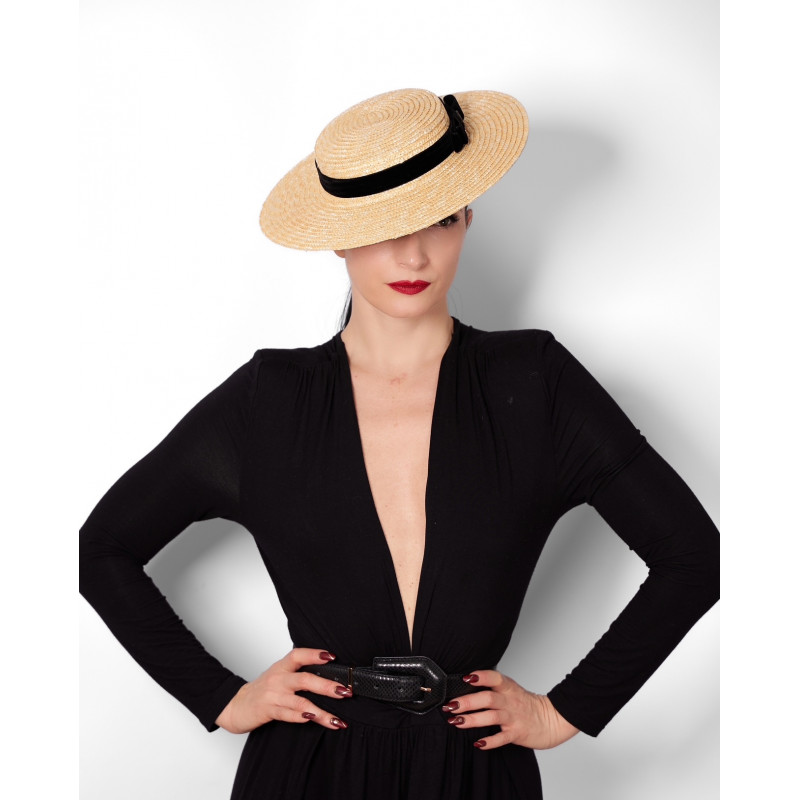 Wide-brimmed hat in natural straw, trimmed with a black ribbon.