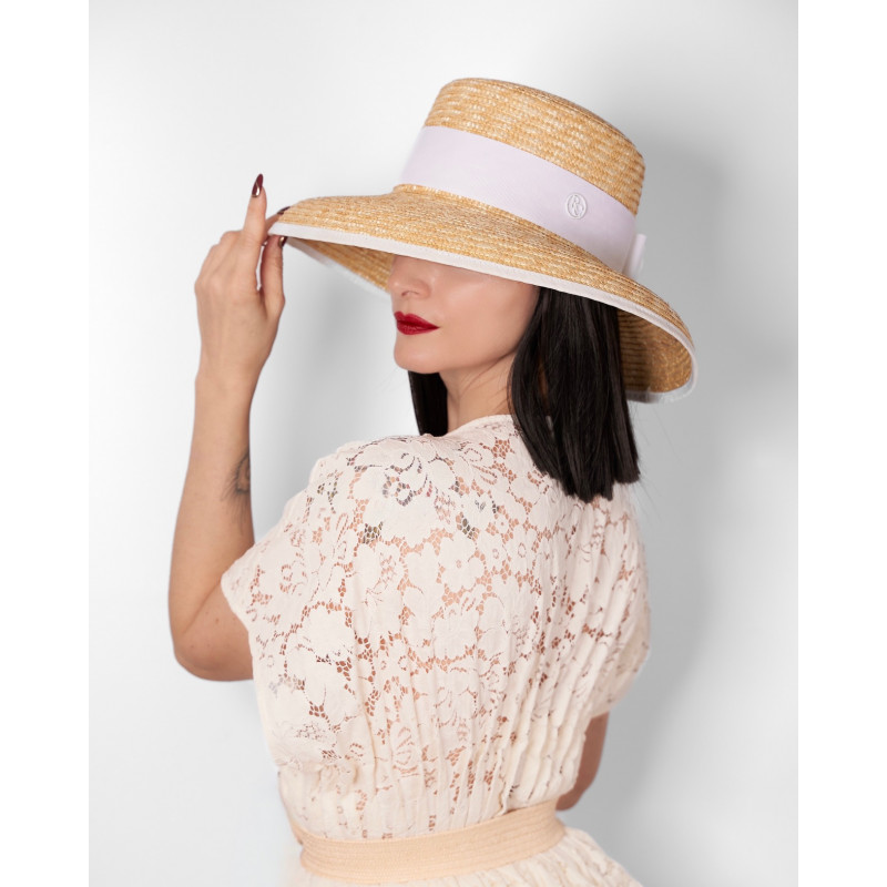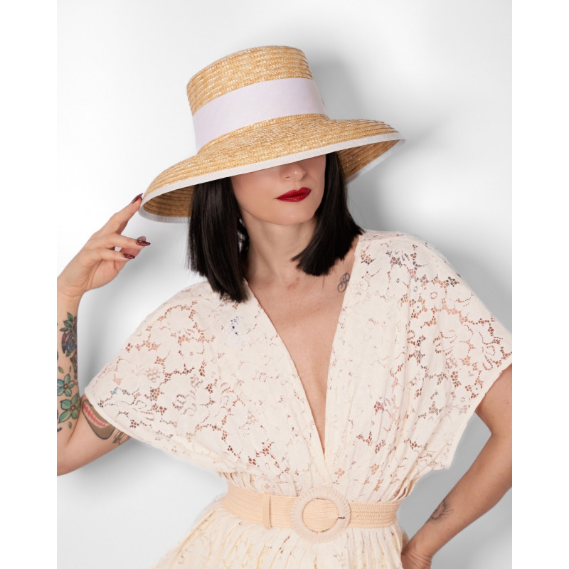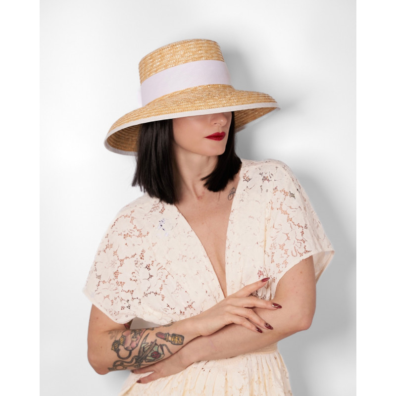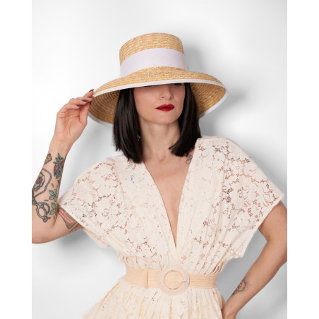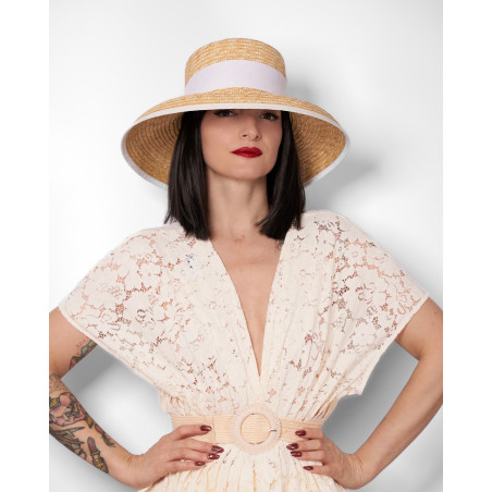 Wide-brimmed hat in natural straw, finished with white grosgrain ribbon.