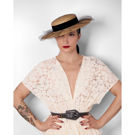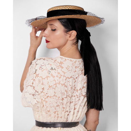 Its straight 6 cm crown and flat 9 cm brim create a precise profile, faithful to the traditional shape. A veil delicately covers the crown and the brim, bringing a more dressed and ceremonial dimension to the design.