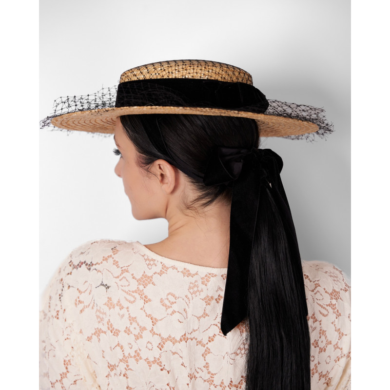 Wide-brim straw capeline with a soft black silk ribbon tied at the back. Made in France.