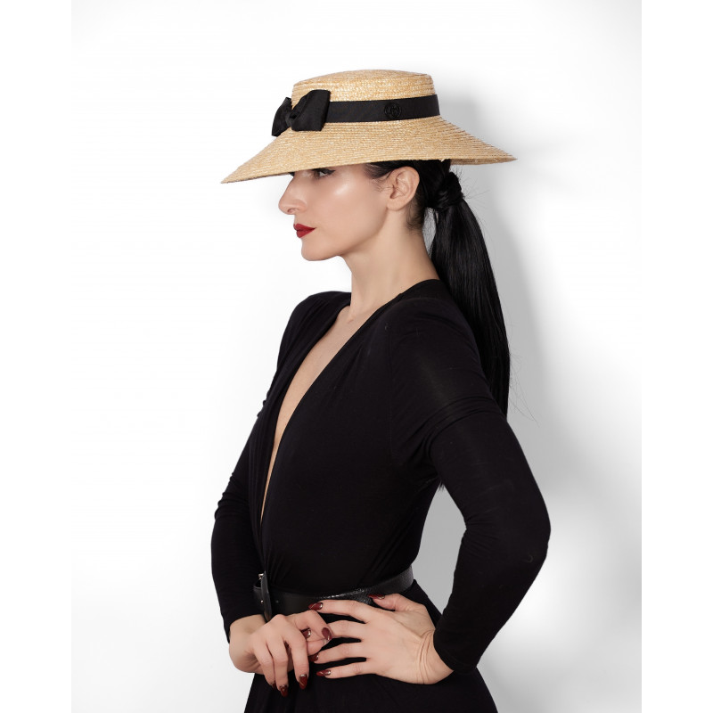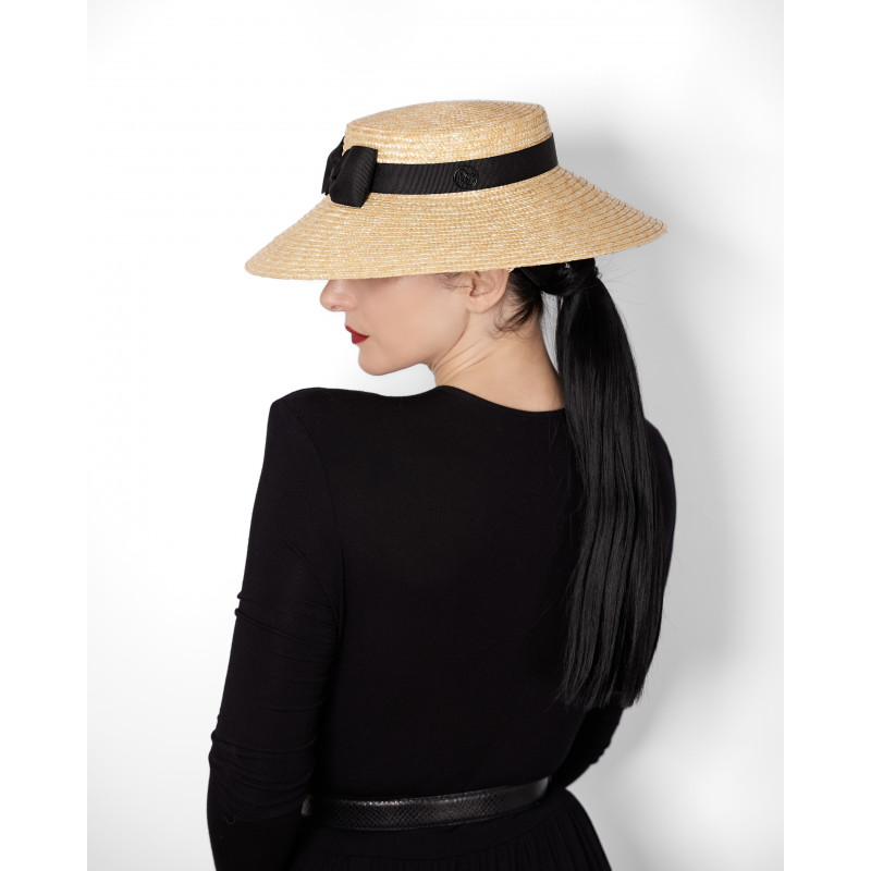 Wide-brimmed hat in natural straw, trimmed with a black ribbon.