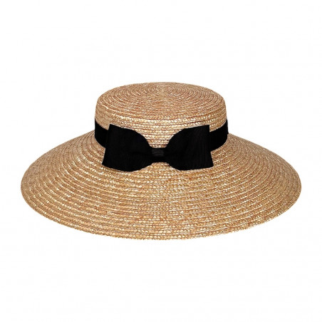 Audrey is a natural straw hat adorned with a black grosgrain ribbon, finished with a bow placed at the front.