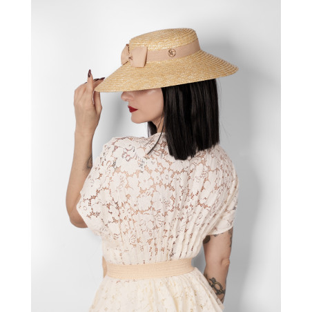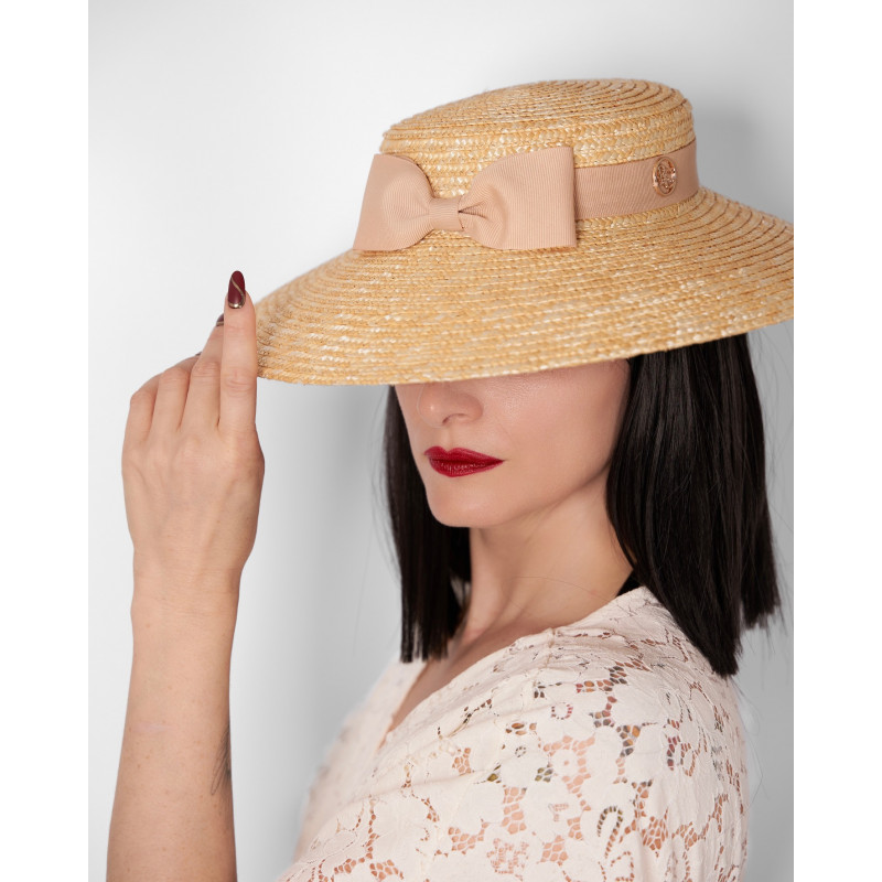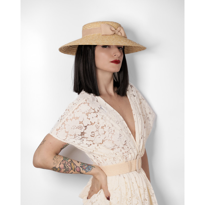 Natural straw, a beige grosgrain ribbon in a subtle tone-on-tone finish, and a bow placed at the front: Audrey captures the New Look spirit of the 1950s with a clean, modern feel.