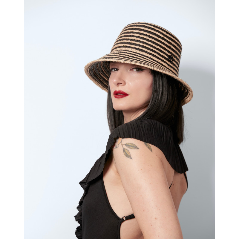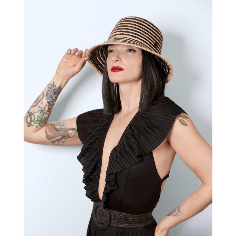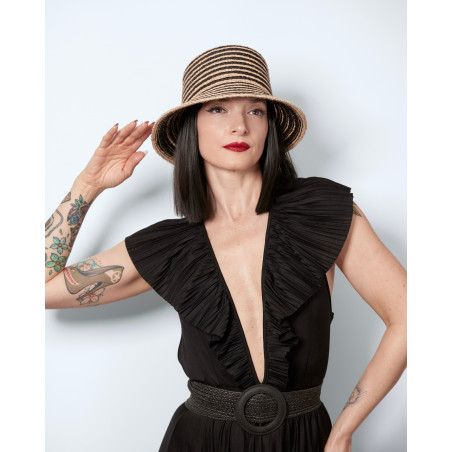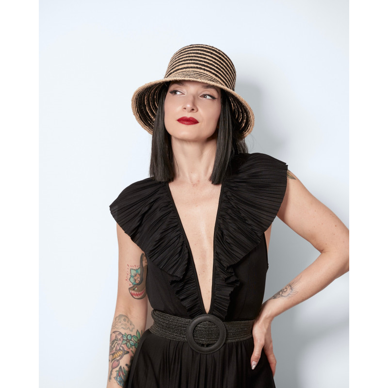 Giulia reimagines the summer hat in a two-tone version, woven in natural straw and black. Halfway between a bucket hat and a cloche-inspired shape, it sits naturally on the head and follows you effortlessly through sunny days.