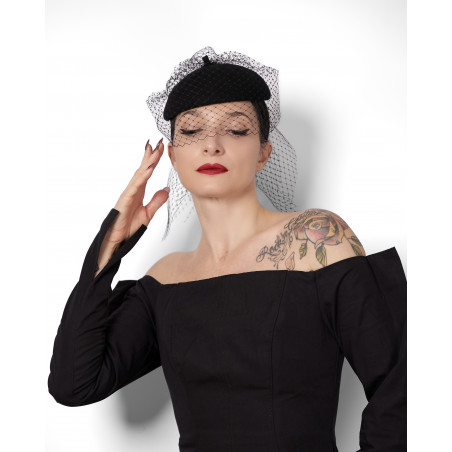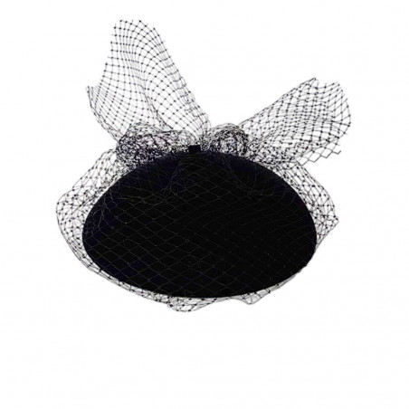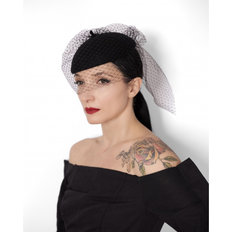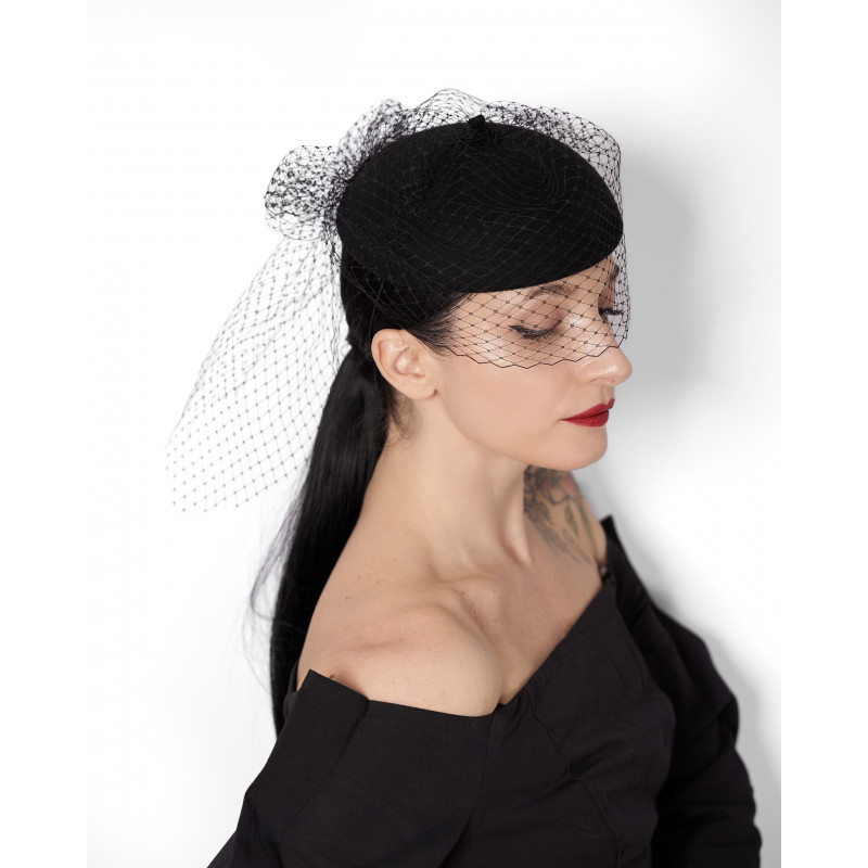 Victoria is a black wool fascinator, finished with a veil delicately tied at the back to form a bow.