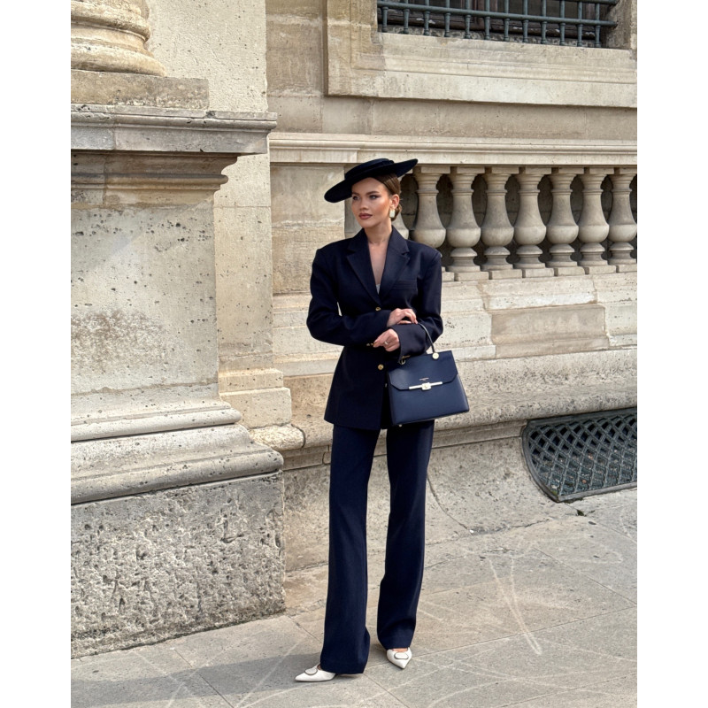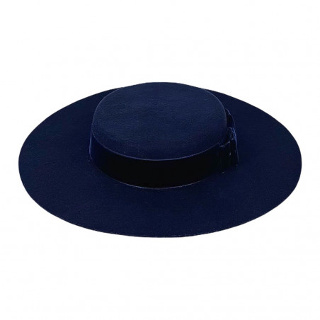 100% wool hat in navy, adorned with velvet ribbons and side bow.