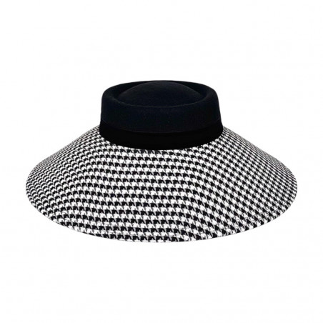 The "mini" version of the classical "Hepburn" hat in houndstooth print. This hat is retro inspired in 100% wool hat, adorned with velvet ribbon and a back bow