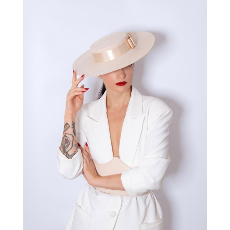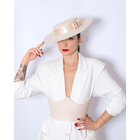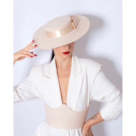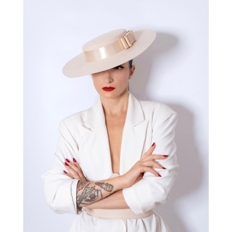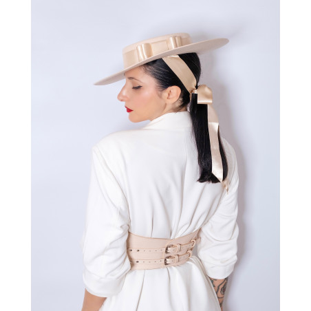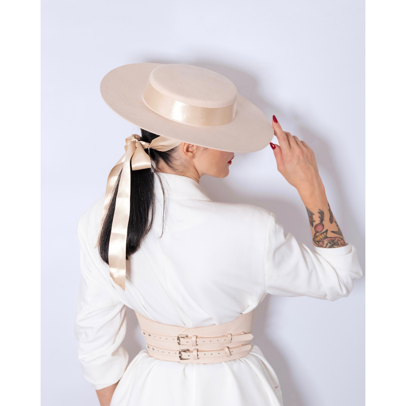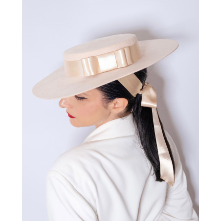 Women boater style hat in champagne 100% wool , adorned with silky ribbons and side bow.