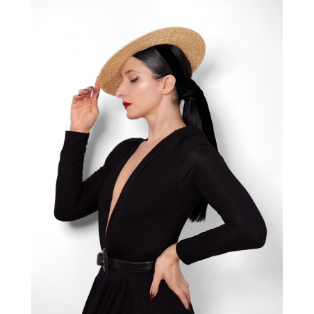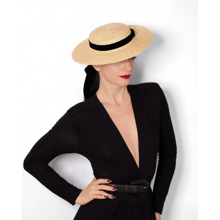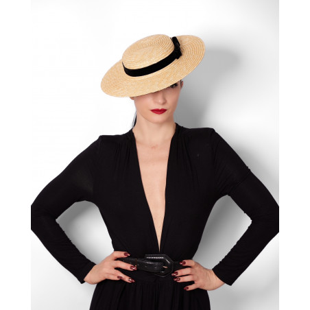Capeline en paille noisette, ornée de rubans en velours. Changez les couleurs des rubans très facilement grâce à ses deux oeillets.