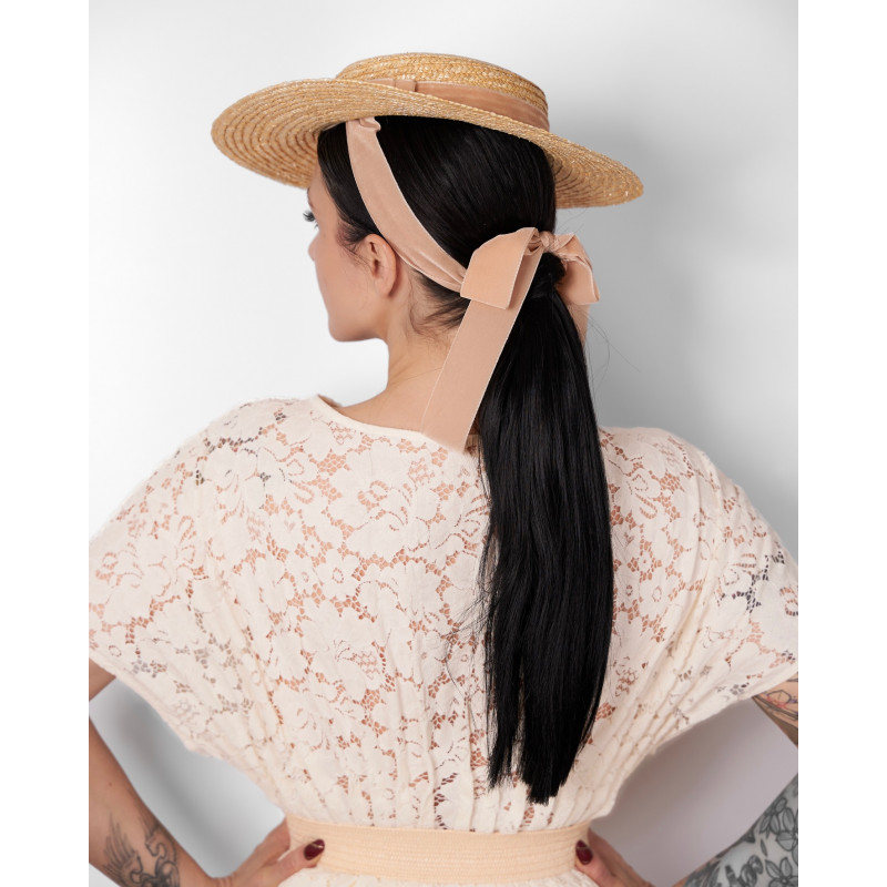 Capeline en paille à large bord, ornée d’un ruban en soie noire. Made in France.