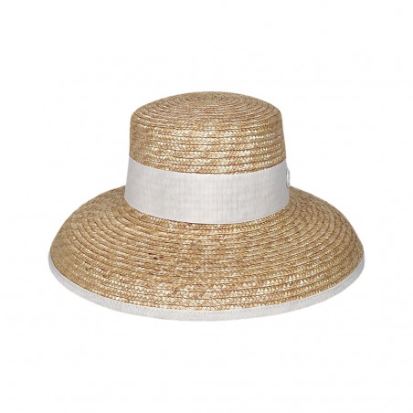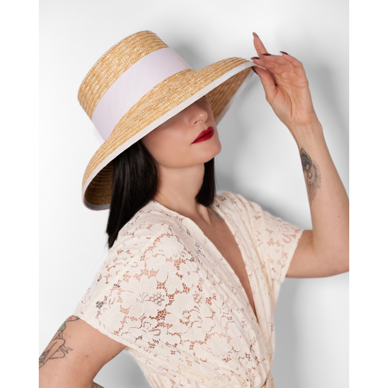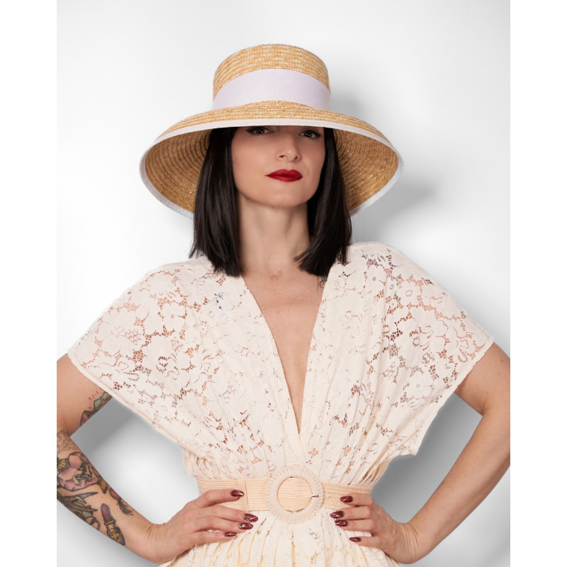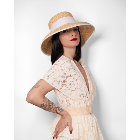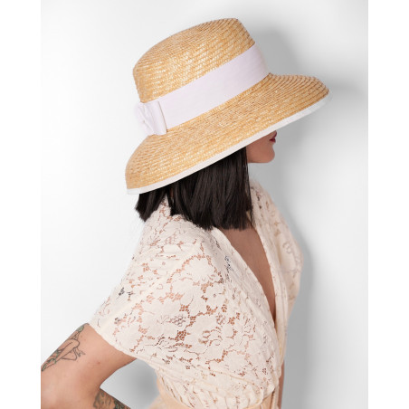 Chapeau en paille naturelle, ornée d'un large ruban gros grain blanc et d'un noeud.