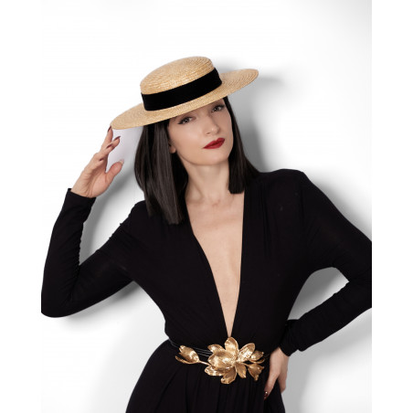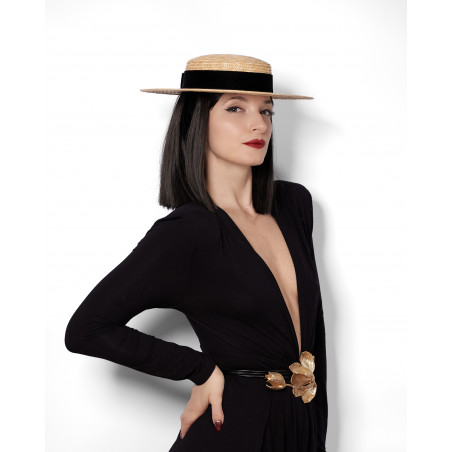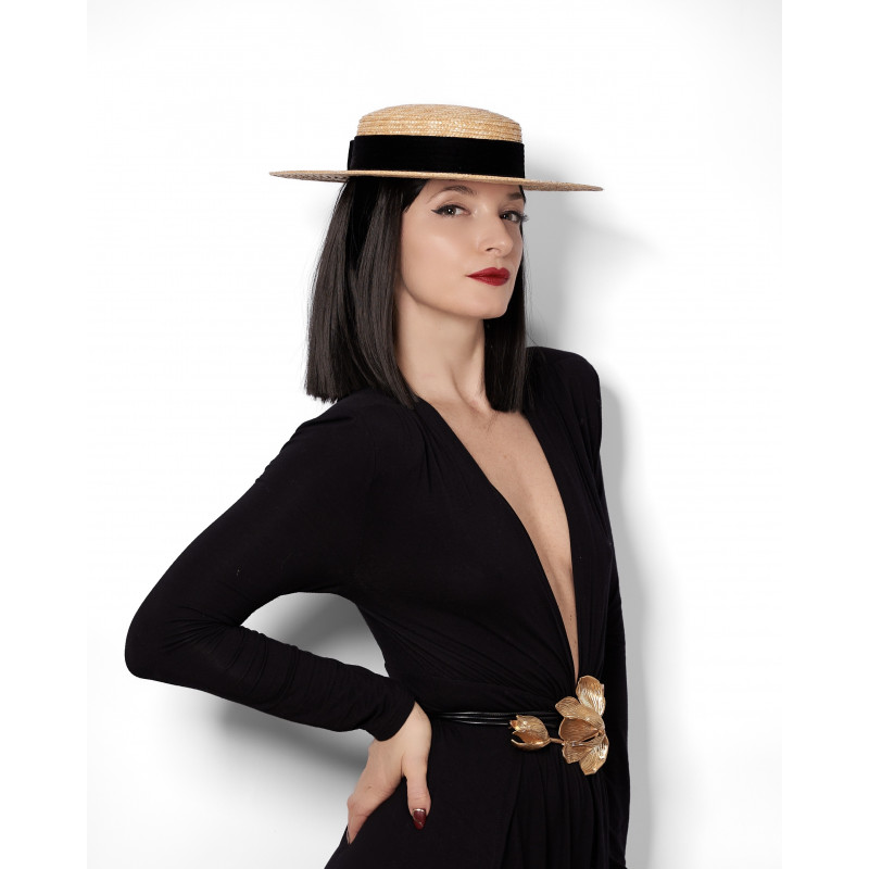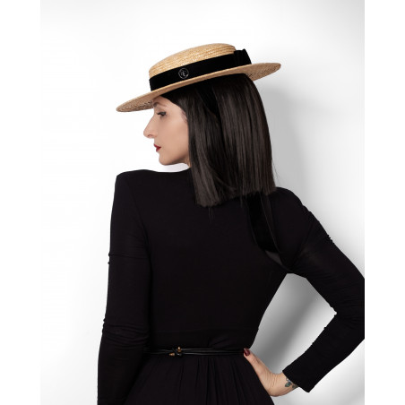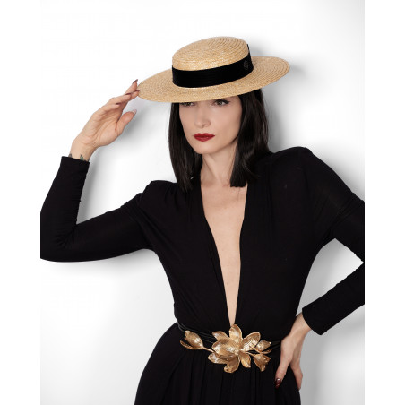 Le canotier VELVET est une interprétation contemporaine d’une forme emblématique du vestiaire féminin. Réalisé en paille naturelle et souligné d’un ruban en velours noir, il incarne ce classique qui traverse les époques avec constance.