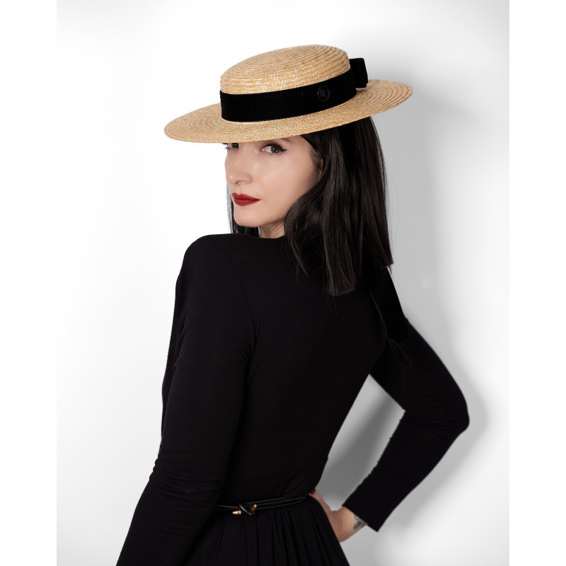 Capeline en paille à large bord, ornée d’un ruban en soie noire. Made in France.