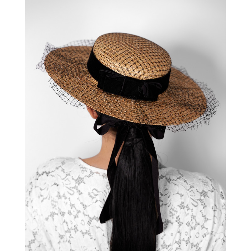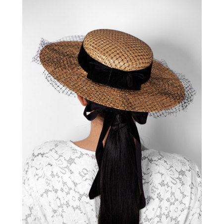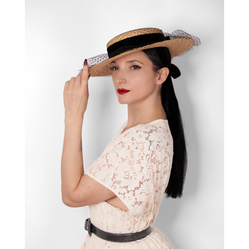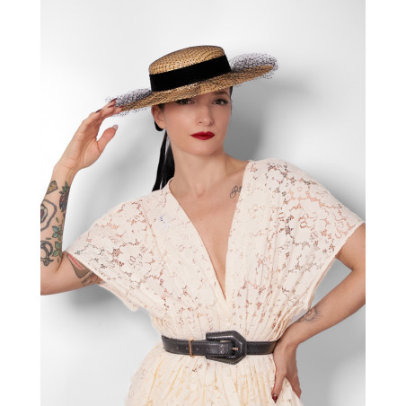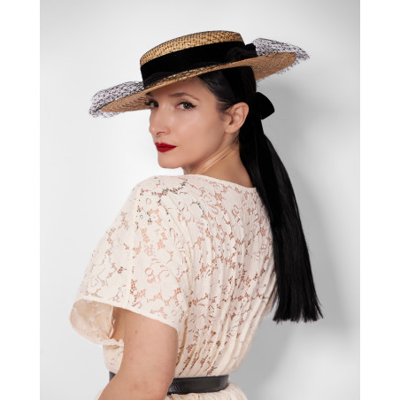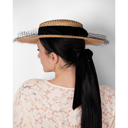 Le canotier Eva reprend la base structurée du modèle VELVET et en propose une interprétation plus formelle. Confectionné en paille naturelle et orné d’un ruban en velours noir, il conserve la silhouette classique du canotier.