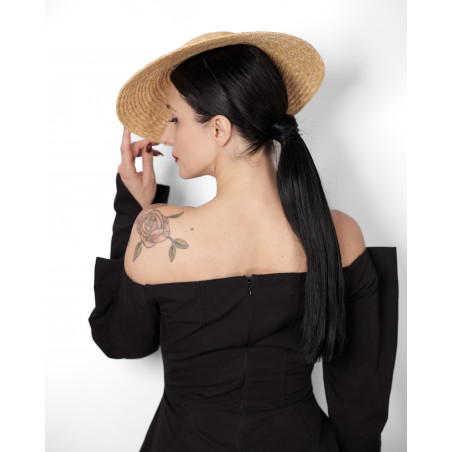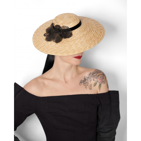 Chapeau à larges bords en paille noire, orné d’un ruban noir assorti.