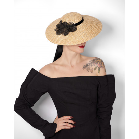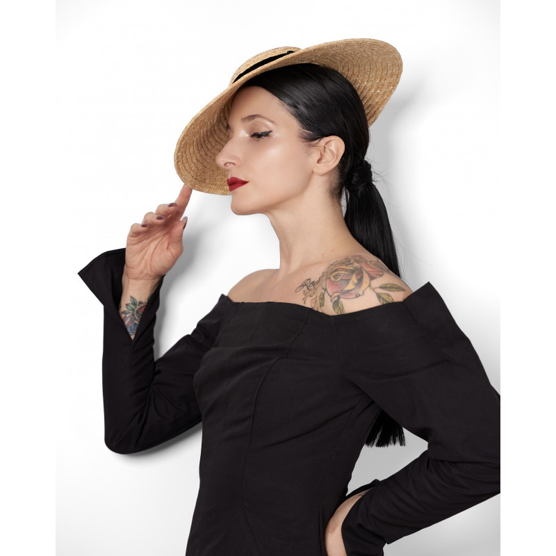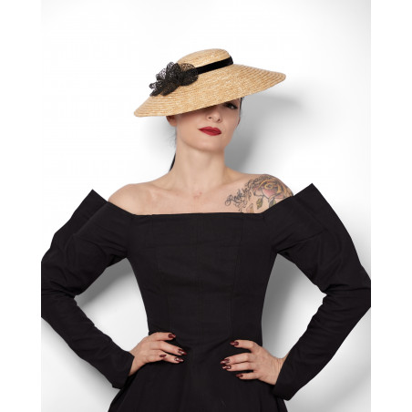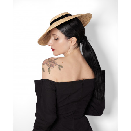 Agnès est un chapeau en paille à petite calotte et bord évasé, inspiré des silhouettes de la fin des années 40 et du début des années 50.