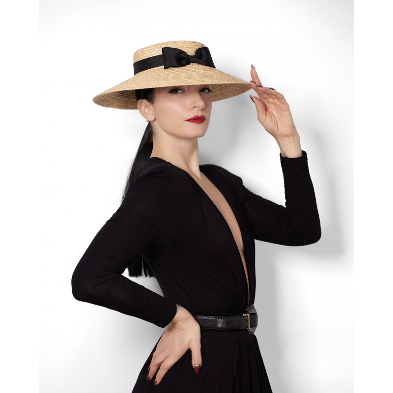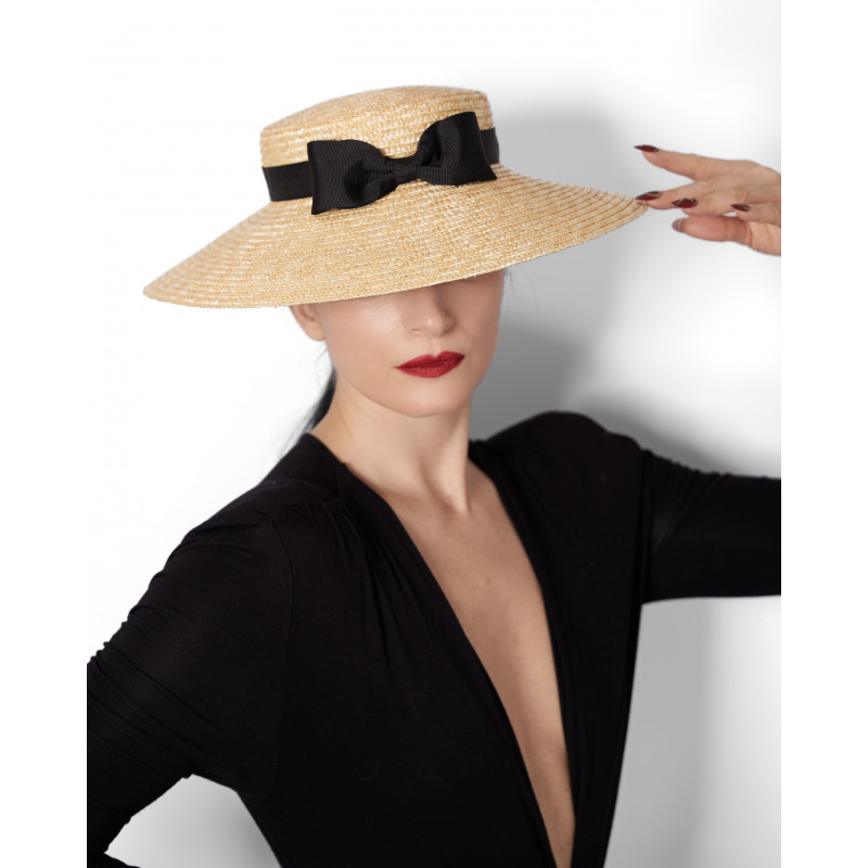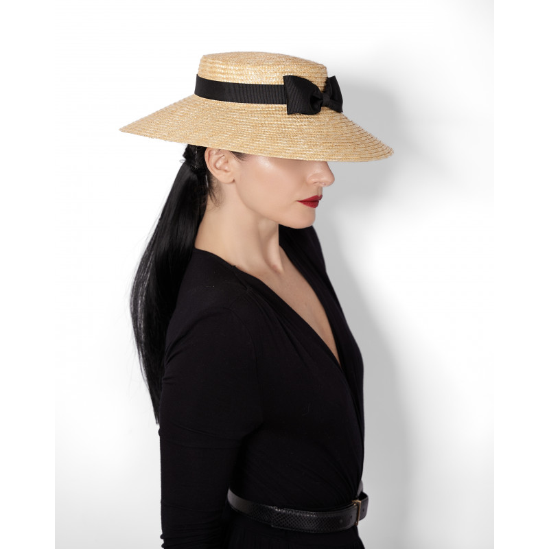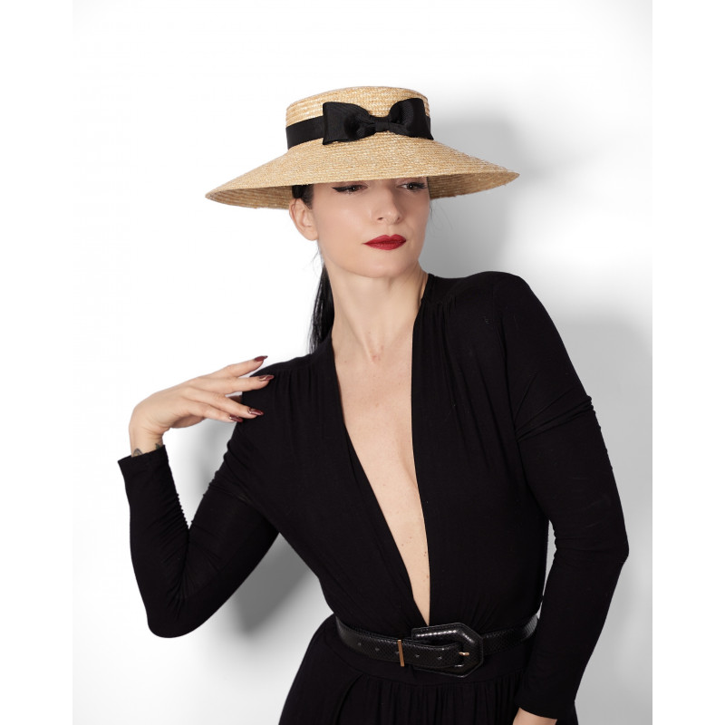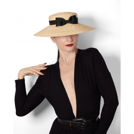 Audrey est un chapeau en paille naturelle orné d’un ruban en gros grain noir, sublimé par un nœud positionné à l’avant.