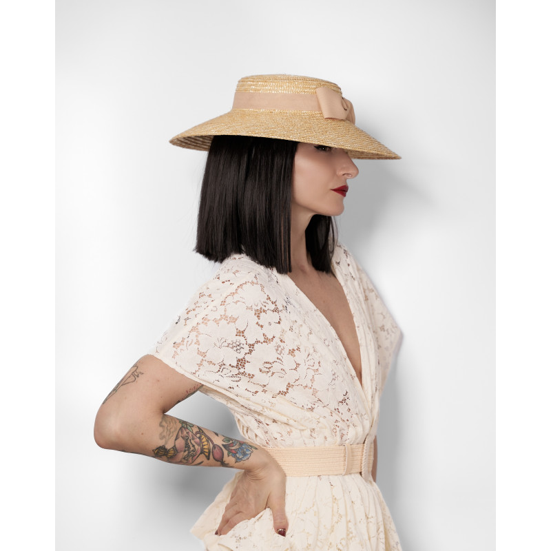 Paille naturelle, ruban gros grain beige en tonalité ton sur ton, nœud placé à l’avant : Audrey reprend l’allure New Look des années 50 avec une simplicité très actuelle.