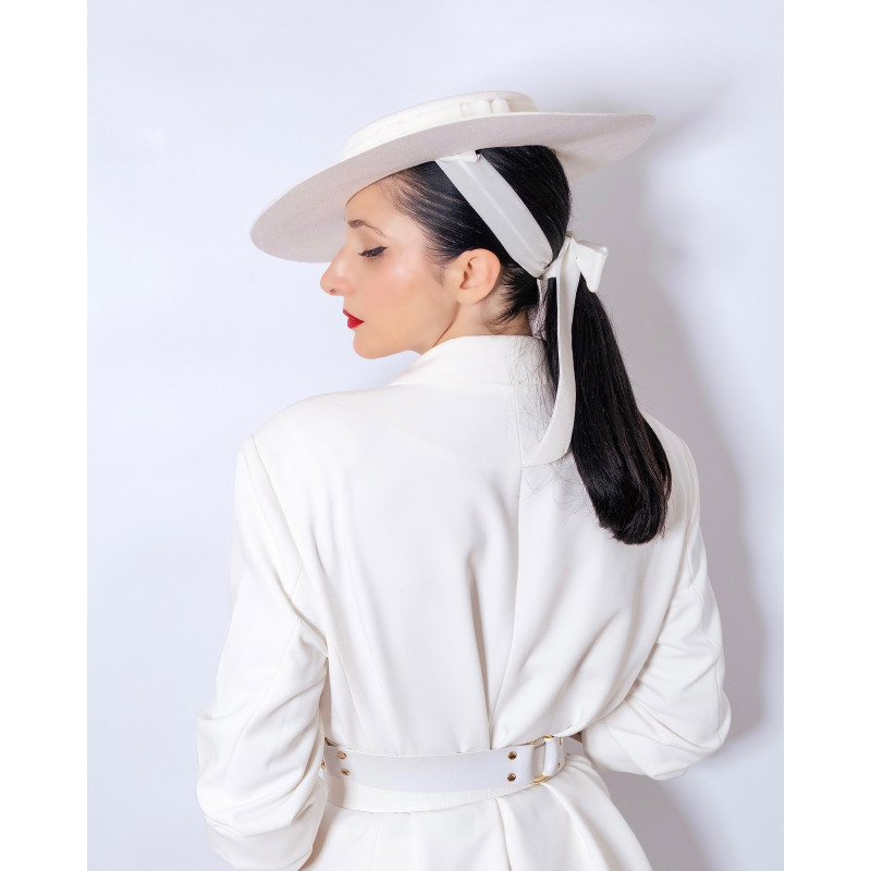 Chapeau canotier femme ivoire 100% laine, orné de rubans en velours d'un noeud plat .