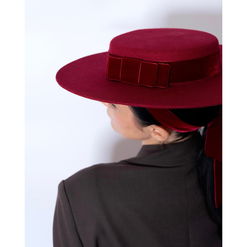 CLAUDIA se décline ici dans un bordeaux profond, apportant une note élégante et chaleureuse à la silhouette. Un canotier pensé pour structurer une tenue avec élégance, particulièrement adapté aux saisons plus froides. Habillé d’un ruban en velours et d’un nœud plat sur le côté, réalisé en laine, ce modèle accompagne naturellement un manteau d’hiver ou une tenue habillée, apportant caractère et distinction sans excès. Entièrement doublé en satin, le chapeau CLAUDIA s’intègre à un vestiaire féminin intemporel. À l’intérieur, un système d’ajustement permet d’adapter CLAUDIA aux tours de tête de la taille 55 à la taille 59. Le chapeau se maintient grâce à un fin élastique à positionner à l’arrière de la tête, associé à ses rubans en velours, à nouer selon la coiffure, sur cheveux lâchés, autour d’une queue-de-cheval ou d’un chignon. Pour découvrir différentes façons de porter votre chapeau et ajuster ses rubans, retrouvez nos conseils dans la section Comment porter votre chapeau.