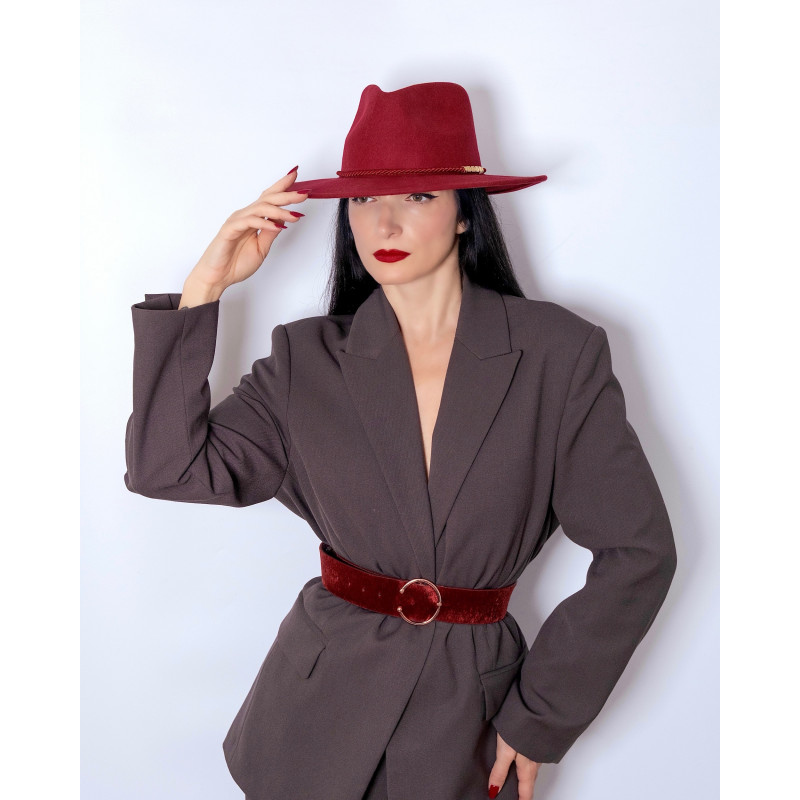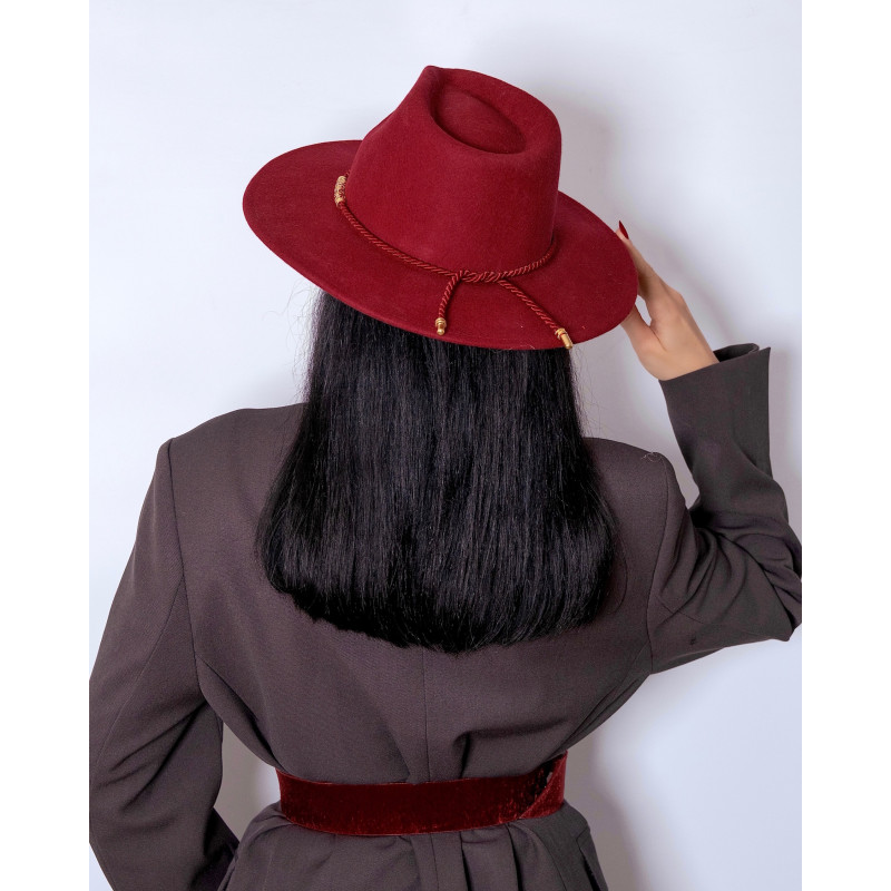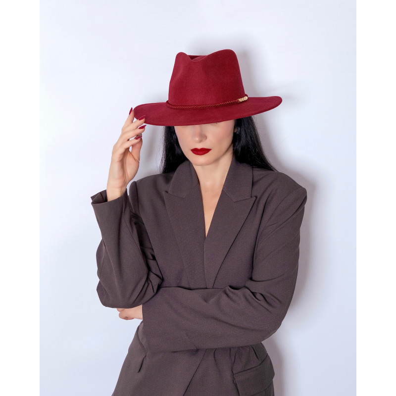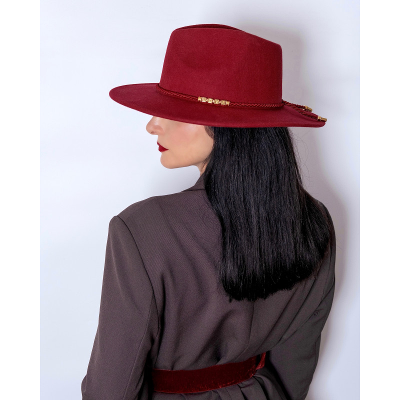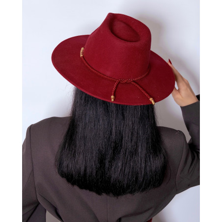 Chapeau fedora femme 100% laine de couleurs bordeaux orné d'un cordon torsadé et de lettres.