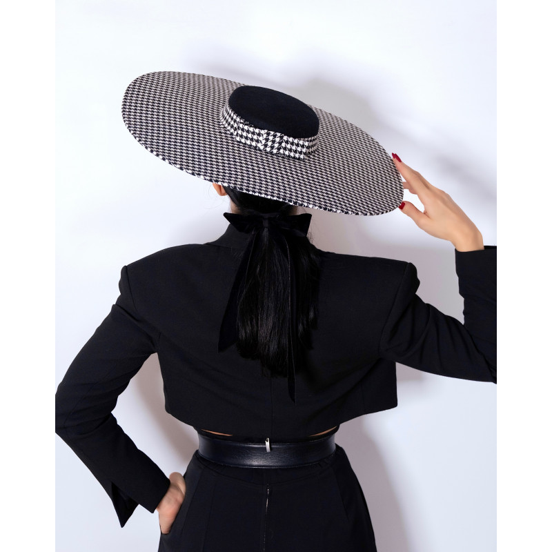 Grand chapeau canotier femme imprimé pied de poule 100% laine, orné d'un noeud plat .