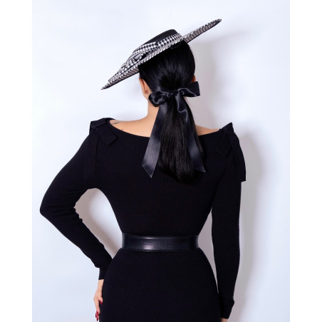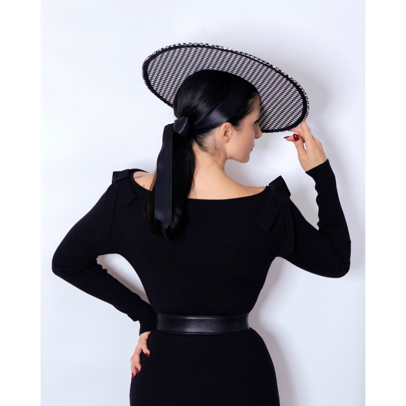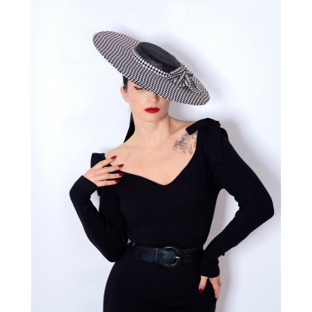 Chapeau à bord plat de type "capeline" en sisal et laine imprimée pied de poule , ornée d'un grand noeud.