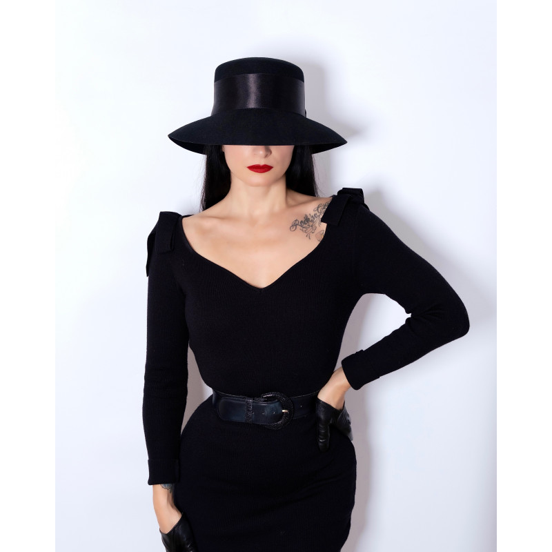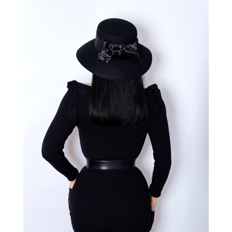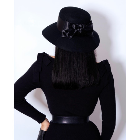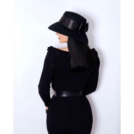 Chapeau en laine noir, orné d'un large noeud en satin.