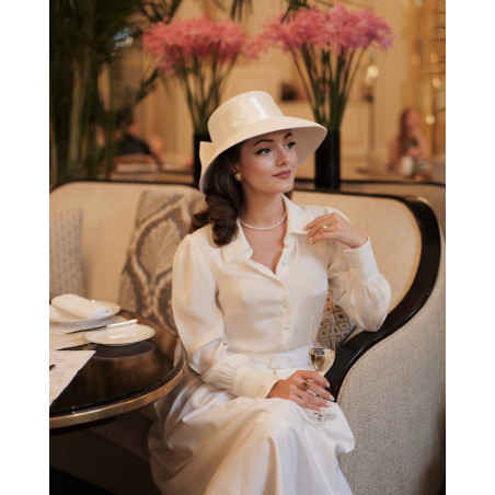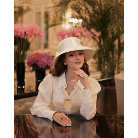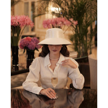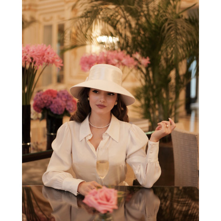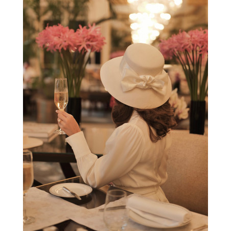 Chapeau en laine blanc cassé, orné d'un large noeud en satin.